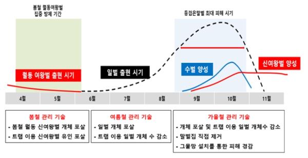 농촌진흥청 양봉생태과 한상미 과장은 “등검은말벌 개체 수를 조정해 등검은말벌 피해를 줄일 수 있는 적기는 여왕벌이 활동을 시작하는 4월부터 6월 초순까지다.”라며, “이때 지역별 방제보다는 전국 동시 방제를 해야 효과가 더 커진다.”라고 말했다.
