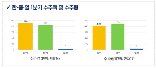 [중앙방송, 박정원기자] 산업통상자원부는 24.1분기 우리나라의 선박 수주액이 136억 달러로 중국을 앞지르면서 세계 1위를 달성했다고 밝혔다. 금번 1분기 한국 수주액은 ’23년 연간 수주액(299억 달러)의 약 45.5%에 해당하는 금액이며, 분기별 기준으로 우리나라 선박 수주액이 세계 1위를 달성한 것은 ’21.4분기 이후 3년 만의 쾌거이다.
