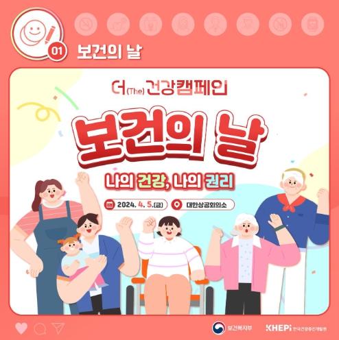 한편, 보건의 날인 4월 7일부터 13일까지 일주일간은 ‘건강주간’으로, 대국민 건강실천 확산을 위한 ‘더(The)건강 캠페인’이 진행된다. 더(The)건강 캠페인은 매월 금연, 구강건강, 신체활동 등 다양한 주제로 진행되는 국민 참여형 이벤트로, 4월에는 건강주간을 맞아 ‘건강권’을 주제로 한 수기 공모전이 진행될 예정이다. 자세한 내용은 보건복지부와 한국건강증진개발원 누리집 및 누리소통망을 통해 확인할 수 있다.