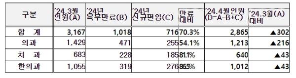 분야별로는 의과가 246명 감소하였고, 치과 및 한의과는 각각 43명씩 감소하였다.