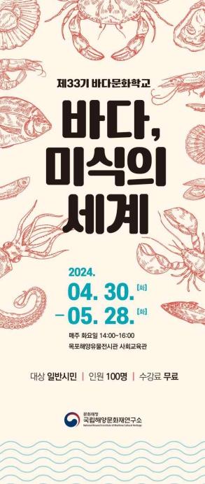 ‘바다문화학교’는 국립해양문화재연구소에서 1995년부터 운영해온 해양 문화 인문학 강좌이다. 이번에는 ‘바다, 미식의 세계’를 주제로 바다가 선사하는 미식의 세계를 탐구하며, 해산물 요리의 역사, 영양학적 가치, 인문학적 의미 등 다양한 관점에서 해산물을 조명한다.