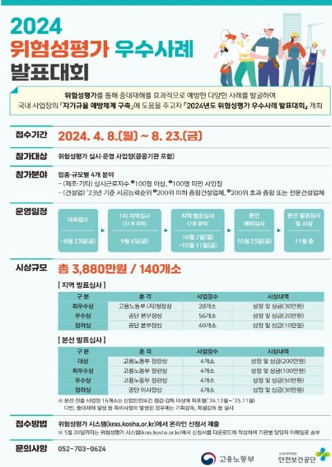 [중앙방송, 김영진 기자] 고용노동부와 안전보건공단(이사장 안종주)은 오는 8일부터 8월 23일까지 위험성평가 우수사례를 공모한다. 위험성평가란 노사가 함께 사업장의 유해위험요인을 찾고 개선하는 과정으로 가장 효과적인 산재예방 활동이다. 우수사례를 제출한 기업은 10월 지역 예선을 거쳐 11월 본선인 ?위험성평가 우수사례 발표대회?에 출전하게 된다.