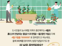 도시농업의 날은 2017년부터는 법정기념일로 지정되어 올해 8회째를 맞이한다. 만물이 소생하는 봄, 도시민의 농사 의욕이 충만해지는 4월과 흙이 연상되는 11일(十 一 = 土)을 합쳐 4월 11일을 도시농업의 날로 정했다.