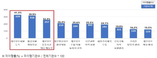 반면, 기관 및 기관장의 개인정보 보호수준 제고를 위한 노력도와 관리?감독의 적정성에 대한 7개 정성지표로 이루어진 전문가 심층진단에서는 7개 지표 모두 전반적으로 점수가 낮게 나타났다. 특히 미흡한 지표는 △개인정보 안전조치의 적절성 및 개선노력(2.32점/6점), △개인정보 보호?관리의 적절성 및 유출?침해 대응계획(2.54점/6점) 등으로 나타났다.