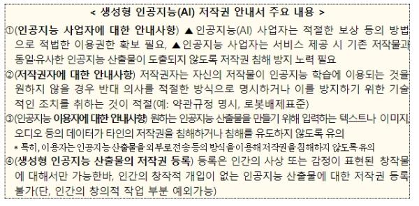 문체부가 지난해 공개한 ‘생성형 인공지능(AI) 저작권 안내서’ 국문본은 ? 인공지능 사업자의 유의사항, ? 저작권자가 취할 수 있는 사전 예방 조치, ? 인공지능 이용자의 유의사항, ? 생성형 인공지능 산출물의 저작권 등록 안내로 구성되어 있다.