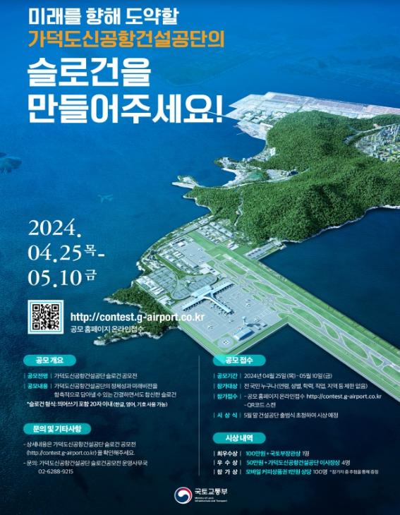 [중앙방송, 박정원기자] 국토교통부는 4월 25일 ?가덕도신공항건설공단법? 시행에 맞춰, 4월 25일부터 5월 10일까지 가덕도신공항건설공단 슬로건 대국민 공모전을 진행한다.