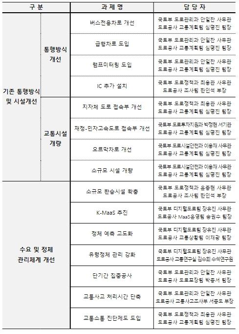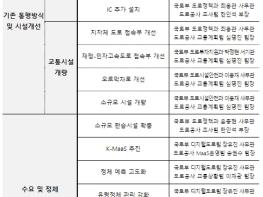 이에 따라 도로 신설·확장과 별개로 교통정체 개선을 위해 관계기관·전문가로 구성된 TF를 통해 통행방식 개선, 기존 시설 개량, 고속도로 수요 및 정체 관리 체계 개선 등에 대한 15대 개선과제를 마련했다.