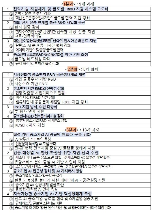2분과 “기술개발(R&D)구조개편”은 ?시장이 원하는 기술개발을 지원하는 방향으로 중소기업 기술개발(R&D) 재설계, ?향후 만들어질 것 같은 시장에 집중 지원하는 미래 지향적 기술개발(R&D), ③기술개발(R&D) 지원방식도 과거의 ‘출연금’ 위주에서 ‘투자?융자’ 등 기업 성장단계와 시장 수요에 맞춰 최적화, ④KOSBIR 대상 사업, 지원체계 실효성을 높이고 범부처 차원에서 중소기업 기술개발(R&D) 전략을 기획?실행할 수 있는 컨트롤 기능도 주문했다.
