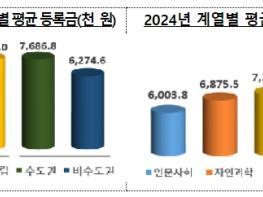 계열별 평균등록금은 예체능(6,759.9천 원), 공학(6,269.7천 원), 자연과학(6,262.1천 원), 인문사회(5,551.7천 원) 순이다.