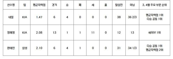 삼성 원태인은 등판한 6경기에서 4승을 거둬 다승 부문 공동 1위를 차지했다. 특히 4월 9일 사직 롯데전부터 4월 26일 고척 키움전까지 4연승을 올리고, 최근 두 경기는 자책점을 허용하지 않아 평균자책점도 2.10으로 KIA 네일에 이어 2위에 올랐다. 원태인은 매 경기 ‘계산이 서는 선발투수’의 모습을 보이며 삼성의 상승세를 주도했다.