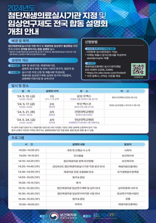 [중앙방송, 서은혁기자] 보건복지부는 유관기관과 함께 5월 10일부터 5월 24일까지 총 4회에 걸쳐 첨단재생의료실시기관 지정 및 임상연구 활성화를 위한 합동 설명회를 개최한다고 밝혔다.
