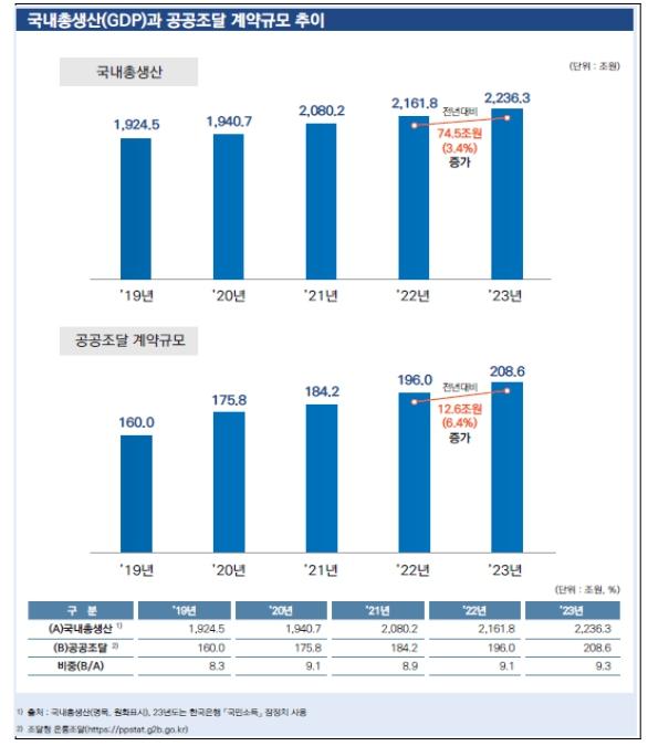 공공조달 규모는 국내총생산(명목GDP 2,236.3조원) 중 9.3%를 차지(역대 최고비율)하면서 공공조달이 내수 활성화와 한국경제 발전에 견인차 역할을 톡톡히 한 것으로 나타났다.