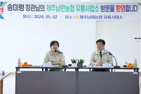 [중앙방송, 박정원기자] 5월 2일 제주를 찾은 송미령 농림축산식품부 장관은 하우스감귤 재배농가와 남원농협 농산물산지유통센터(APC, Agriculture Product Processing Center)를 방문하여 현장의 애로사항을 청취하고, 제주 농산물 생산·유통 관계자들을 격려했다.