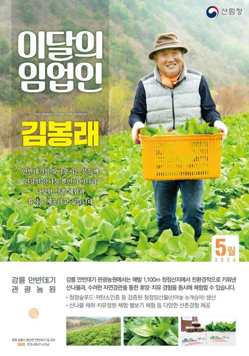 [중앙방송, 박정원기자] 산림청은 ‘이달의 임업인’으로 강원 강릉의 ‘안반데기’에서 산나물을 재배하는 임업인 김봉래(58세, 강릉안반데기관광농원) 대표를 선정했다고 2일 밝혔다.
