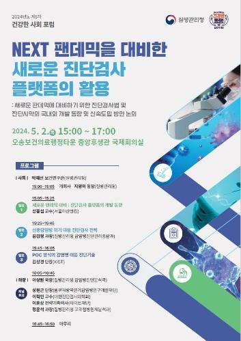 [중앙방송, 서은혁기자] 질병관리청은 5월 2일 ‘넥스트(Next) 팬데믹을 대비한 새로운 진단검사 플랫폼의 활용’을 주제로 '제5차 건강한 사회 포럼'을 개최한다고 밝혔다.