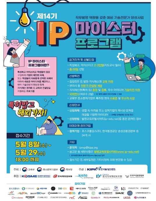 [중앙방송, 이온세기자] 교육부는 중소벤처기업부·특허청과 공동으로 ‘제14기 지식재산(IP) 마이스터 프로그램’ 참가자를 5월 8일부터 5월 29일까지 모집한다.