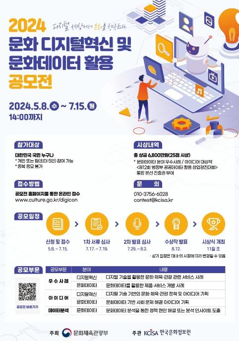 [중앙방송, 김혜영기자] 문화체육관광부는 한국문화정보원과 함께 5월 8일부터 7월 15일까지 ‘2024 문화 디지털혁신 및 문화데이터 활용 공모전’을 열고 문화 분야에서 디지털 기술 및 문화데이터를 활용한 창의적인 아이디어와 우수사례를 찾는다.