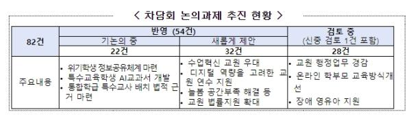 ‘초·중등 수업혁신’ 관련 과제는 차담회에서 논의된 내용이 교육부 정책에 반영된 대표적인 사례이다. 교사의 자발적 수업혁신을 지원하는 정책과 교원의 디지털 역량을 고려한 연수 지원이 필요하다는 차담회 제안 내용을 정책에 반영하여 교육부는 '자율적 수업혁신 지원방안(2024.3.12.)', '디지털 기반 교육혁신 역량 강화 방안(2024.4.15.)'을 발표했다.