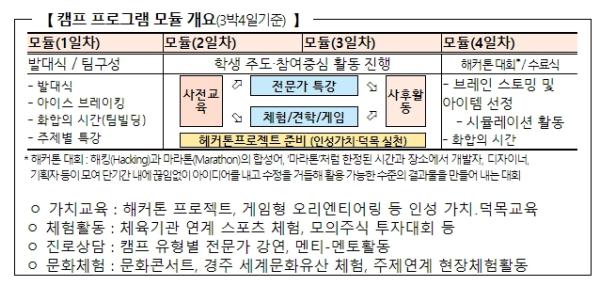 리더십새싹 캠프는 다양한 체험학습과 각 분야 명사 특강, 끝장 토론(해커톤 프로젝트)*등으로 구성되며, 학생들은 캠프 활동에 주도적으로 참여하는 가운데 존중·배려·소통 등의 덕목을 함양할 것으로 기대된다.