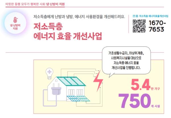 · 2024년에는 기초생활수급자 등 저소득층 5만 4,000가구(난방 3만 6,000, 방 1만 8,000), 지역아동센터 등 사회복지시설 750개소(난방 250개소, 냉방 500개소)를 선정·지원