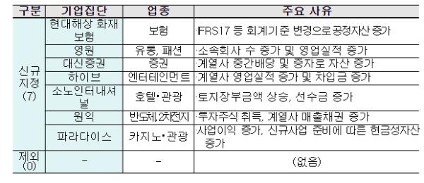 구체적으로 하이브는 엔터테인먼트업 주력집단 최초로 지정됐고, 카지노?관광업 주력집단인 파라다이스, 호텔?관광업 주력집단인 소노인터내셔널 및 아웃도어?스포츠 의류 판매업 주력집단인 영원 등이 신규로 지정됐다.