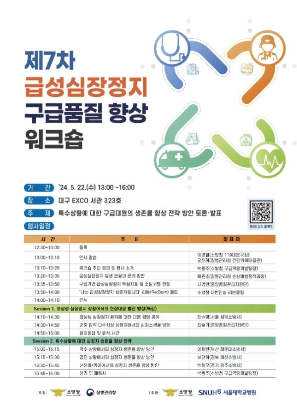 [중앙방송, 서은혁기자] 질병관리청과 소방청은 5월 22일 13시부터 16시까지 대구 EXCO(대구광역시 북구 소재)에서 '제7차 급성심장정지 구급품질 향상 워크숍'을 개최한다고 밝혔다.