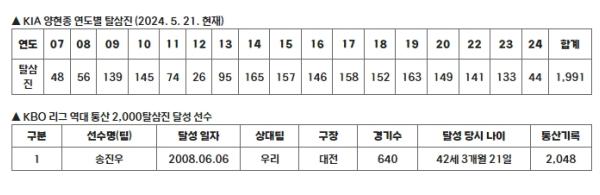 한편 양현종은 KBO 리그 개인 최다 탈삼진 기록에도 근접했다. 현재 기록을 보유하고 있는 송진우의2,048개에도 57개 차로 근접해 이번 시즌 대기록 경신이 가능하다. 또한 2014 시즌부터 2023시즌까지 9시즌 연속 세자릿 수 탈삼진을 기록한 양현종은 탈삼진 56개를 추가하면 전 해태 이강철, 전 두산 장원준과 함께 10시즌 연속 세자릿 수 탈삼진으로 이 부문 연속 기록 최다 타이를 이루게 된다.
