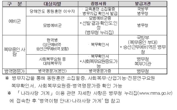병무청이 추진하고 있는 '나라사랑 가게'사업은 음식점, 카페, 숙박업소 등의 업체와 협약을 체결하여 당해연도 동원훈련 이수 예비군, 현역병?사회복무요원 복무 중인 사람, 병역명문가 등 병역을 성실히 이행하는 사람에게 일상생활에서 체감할 수 있는 실질적인 혜택을 제공하는 사업이다.