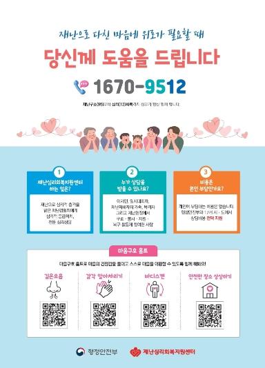 이번 지진으로 마음이 힘든 국민은 누구든지 시?도 재난심리회복지원센터에 방문 또는 전화(1670-9512)하면 심리상담을 받을 수 있다.