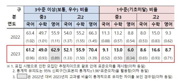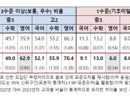 교과별 성취 수준은 전반적으로 전년과 유사한 비율로 나타났으나, 중학교 영어의 학업성취도는 상승했다. 중학교 영어의 경우 3수준(보통학력) 이상 비율이 전년 대비 7.0%p 상승했고, 1수준(기초학력 미달)은 2.8%p 감소했다.