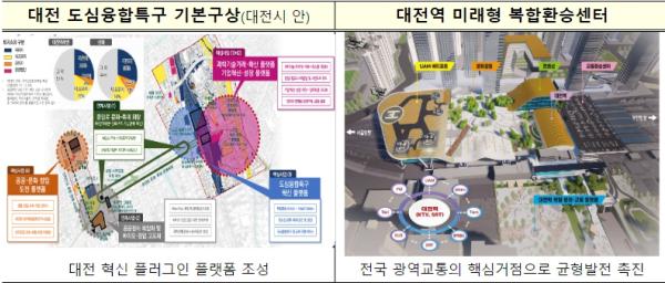 대전 도심융합특구는 대전역 및 옛 충남도청사 일대를 미래형 복합환승센터와 역세권 개발, 지식산업센터 등 청년과 기업이 모일 수 있는 융·복합 성장거점으로 조성하는 사업으로, 충청권 메가시티의 출발점이자 도시공간 혁신의 진원지로 육성할 계획이다.