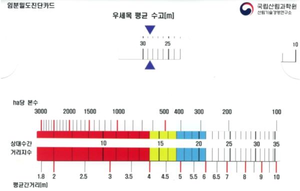 이번에 산림기술경영연구소가 개발한 임분밀도진단카드는 해당 숲의 나무 높이와 밀도를 이용해 현장에서 간편하게 솎아베기 작업 시행 여부를 결정할 수 있도록 했다.