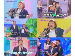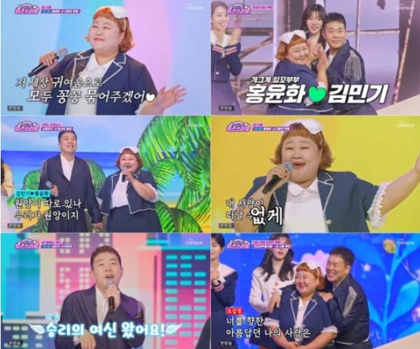 이날 방송에서 홍윤화 김민기 부부는 깜찍한 커플룩을 맞춰 입고 등장했다. 오프닝 무대 내내 두 손을 맞잡은 채 마주 보며 노래하는 홍윤화와 김민기의 모습은 보는 이들을 미소 짓게 했다.