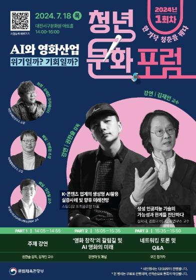 [중앙방송, 김혜영기자] 문화체육관광부는 7월 18일 오후 2시, 대전서구문화원 아트홀에서 ‘인공지능(AI)과 영화산업, '위기일까?, 기회일까?'’를 주제로 2024년 제1차 청년문화포럼을 개최한다. 청년 영화인, 인공지능 및 영화산업 관련 대학생, 문체부 2030자문단, 청년보좌역, 청년인턴 등 청년 150여 명이 한자리에 모여 인공지능과 영화의 만남이 창출하는 다양한 기회와 도전, 미래 가능성을 논의한다.