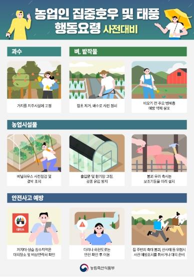 농식품부는 오늘부터 8월 5일까지 저수지·배수장의 가동상태 및 안전관리 실태 점검, 비닐하우스·과수원 등 원예시설과 축산시설의 지주시설 결박 및 주변 배수로 정비상태, 산사태 취약지역의 사방시설물, 배수로, 주민대피체계 등을 집중 점검하고 보완할 계획이다.