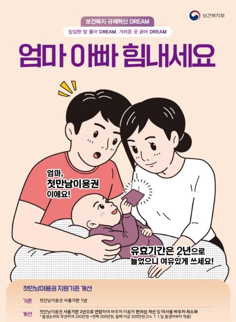 보건복지부는 첫만남 이용권의 사용기한이 1년이었으나, 2024년 3월 시행령 개정을 통해 2024년 출생 아동부터는 사용기한을 2년으로 연장하여 바우처 이용자의 편의성을 개선했다. 또한, 공공산후조리원의 경우 임산부실과 영유아실은 2층 이하에만 설치하도록 규정했으나, 2023년 9월부터 안전요건 충족 시 최대 5층 이하에서도 설치 가능하도록 기준을 완화했다.