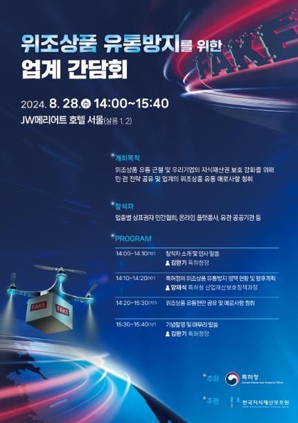 [중앙방송, 박정원기자] 특허청은 8월 28일 14시, JW 메리어트 호텔(서울 서초구)에서 현장소통의 일환으로 업종별 상표권자 민간협회, 온라인 플랫폼사, 유관 공공기관 등이 참석하는 '위조상품 유통방지 업계 간담회'를 개최했다.