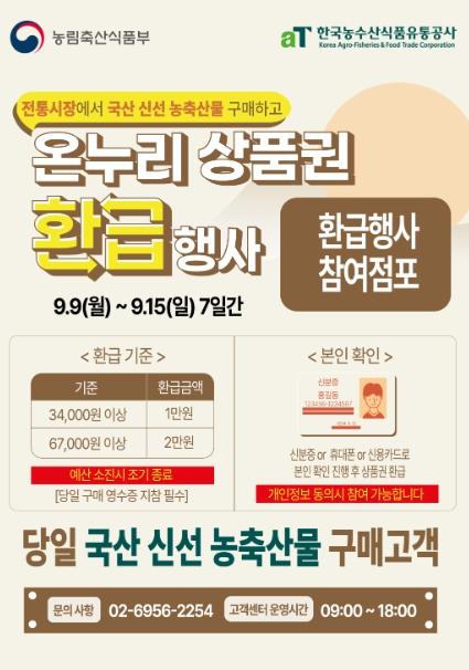 이번 행사는 전통시장에서 국산 농축수산물을 구매한 소비자들에게 구매 금액의 최대 30%를 1인당 수산물 2만원, 농축산물 2만원 한도에서 온누리상품권으로 환급해 주는 행사이다. 전통시장에서 국산 농축수산물을 구매한 소비자가 영수증과 신분증을 지참하여 시장 내 환급 부스를 방문하면 본인 확인 후 온누리상품권으로 환급받을 수 있으며, 행사 참여 시장 등 자세한 내용은 공식 누리집에서 확인할 수 있다.