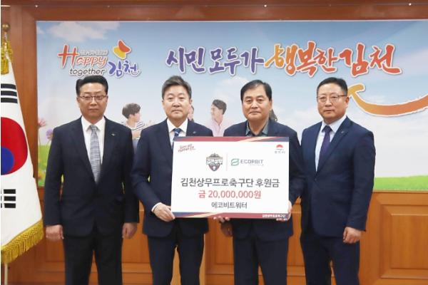 김천상무프로축구단이 10월 25일, 김천시청에서 (주)에코비트워터의 후원금 전달식을 진행했다. 행사에는 김충섭 구단주를 비롯하여 에코비트워터 김인석 대표이사, 김동국 경상권지사장, 이찬호 소장과 김천상무 배낙호 대표이사가 참석했다.