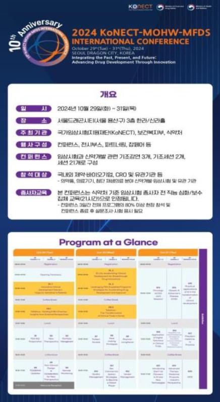 올해 10번째를 맞는'2024 코넥트 임상시험 국제 콘퍼런스'는 국내?외 바이오 전문가, 제약기업 개발자, 임상 연구자, 규제기관, 임상시험수탁기관(CRO) 임상 전문가 등 약 350개 기업 및 기관의 신약개발 전문가 1,300여 명이 참석하는 아시아 최대 규모의 임상시험 콘퍼런스로 자리매김하고 있다.