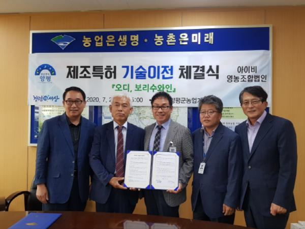 양평군(군수 정동균)이 7월 23일 농업기술센터에서 아이비영농조합법인과 오디와인, 보리수와인 제조 특허 기술이전 체결 식을 개최했다