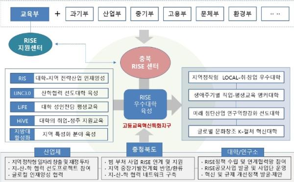 ‘라이즈’는 지자체의 대학지원 권한 확대와 규제 완화를 통해 지자체 주도로 대학을 지원하여 지역과 대학의 동반 성장을 추진하는 체계로, 2023~2024년 시범지역 운영을 거쳐 2025년 전 지역에 도입할 계획이다.