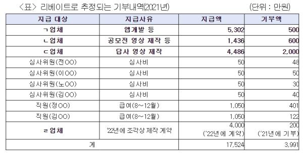 기념사업회는 이와 함께, ㄴ업체와 ㄷ업체에 영상 제작 사업비로 각각 1천 4백만원, 4천 5백만원을 지급하고 기부금으로 6백만원과 2천만원을 받은 것으로 드러났으며, 온라인 공모전 심사비와 직원 인건비로 2천 3백만원을 집행하고, 당사자들로부터 7백만원을 기부받은 것으로 확인됐다.