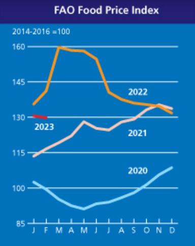 [중앙방송, 손미정기자] 유엔 식량농업기구(FAO)에 따르면, 2023년 2월 세계식량가격지수는 전월(130.6포인트) 대비 0.6% 하락한 129.8포인트를 기록했다. 곡물을 비롯한 대부분 품목군의 가격이 하락했으나 설탕 가격은 상승했다.