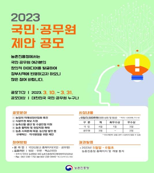 [중앙방송, 김영진 기자] 농촌진흥청은 3월 10일부터 3월 31일까지 학생, 시민, 공무원 등 전 국민을 대상으로 ‘2023년 국민?공무원 제안 공모전’을 실시한다고 밝혔다.