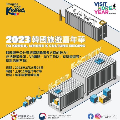 3월 25일과 3월 26일에는 홍콩 이스트포인트시티 쇼핑몰에서 현지 소비자들을 대상으로 하는 ‘K-관광 로드쇼’를 열어, ‘한국방문의 해’를 비롯해 참가 기관들의 관광콘텐츠를 마케팅하고, 아이돌 댄스 배우기, K-뷰티 메이크업 체험, 치맥 시식 등 K-컬처 체험 기회를 제공한다.