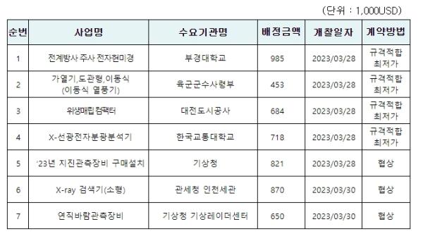 금주 집행되는 외자분야 입찰을 계약방법별로 보면,부경대학교 수요 ‘전계방사 주사 전자현미경’ 등 “규격적합자 중 최저가에 의한 계약”이 전체 금액의 88.6%인 751만불 (약 99억 원), 관세청 인천세관 수요 ‘X-ray 검색기(소형)’ 등 “협상에 의한 계약”이 전체 금액의 11.4%인 297만불 (약 40억 원) 으로 진행된다.