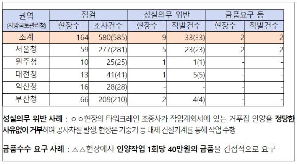 국토교통부는 특별점검에서 확인된 불법·부당행위 외에 지방국토관리청의 불법행위 대응센터에 접수된 부당금품 요구, 채용강요 등 28건에 대해서도 경찰에 수사를 의뢰하는 등 적극적인 대응에 나설 계획이다.