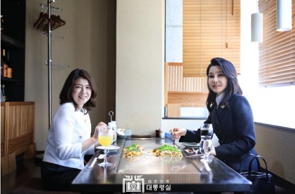 김 여사는 세심하게 배우자 프로그램을 준비하고 오찬에 초청해준 기시다 여사에게 감사를 전하고, “여사님과 기시다 총리님의 고향인 히로시마를 방문하게 되어 더욱 뜻깊다”고 말했다. 기시다 여사는 이번 G7 정상회의를 계기로 히로시마를 소개할 수 있어 기쁘다면서 김 여사에게 히로시마풍 오코노미야키에 대해 설명했다. 두 정상 배우자는 오코노미야키를 함께 맛보며 전날의 G7 정상회의 친교 만찬, 양국의 식문화, 가족·반려동물, 건강관리와 취미생활 등에 이르기까지 다양한 주제에 대해 이야기를 나눴다.