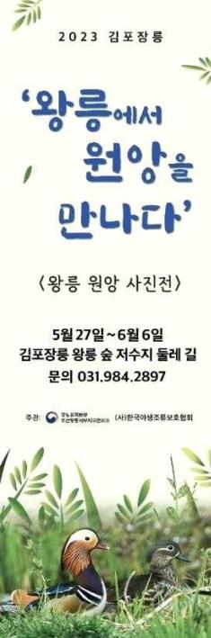 [중앙방송, 김혜영기자] 문화재청 궁능유적본부 조선왕릉서부지구관리소(소장 오명석)는 사단법인 한국야생조류보호협회(이사장 윤순영)와 함께 5월 27일부터 6월 6일까지 10일간(휴관일 월요일 제외) 김포 장릉 왕릉 숲 저수지 둘레길(경기도 김포시)에서‘왕릉 숲길 원앙 사진전’을 운영한다.